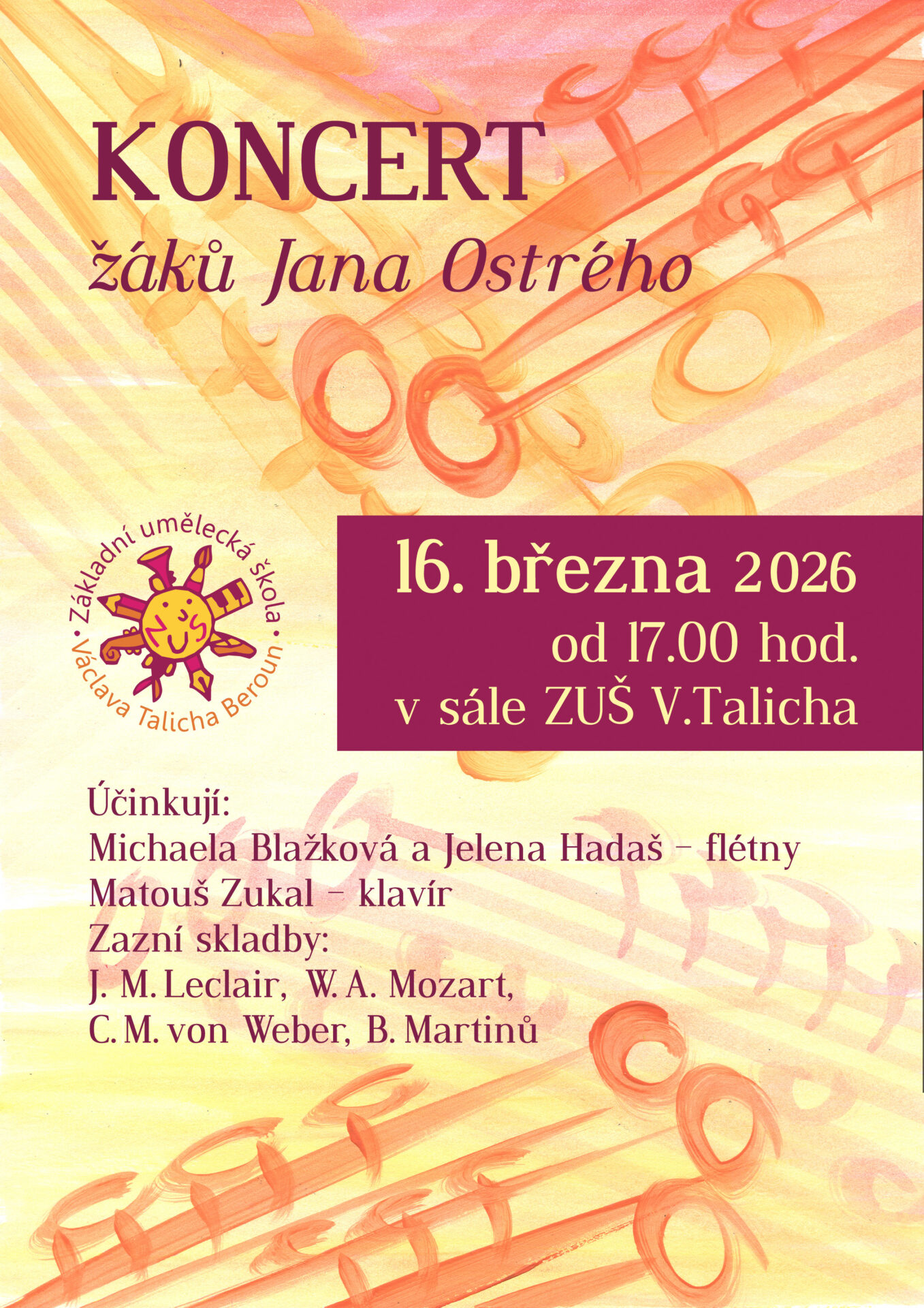 Zveme vás na koncert žáků flétnisty Jana Ostrého, který proběhne 16. 3. 2026 od 17.00 v sále budovy v Berouně.