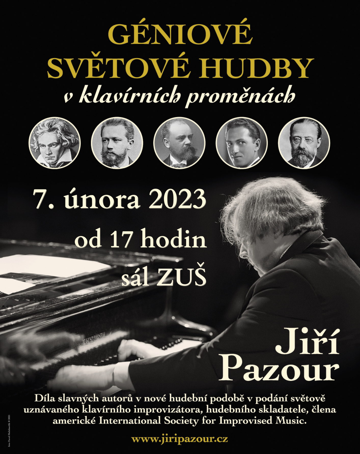 Géniové světové hudby v klavírních proměnách je jedním z projektů klavíristy a hudebního skladatele Jiřího Pazoura. Během večera zněla známá hudební díla českých i světových skladatelů, která byla interpretována v originálních zpracováních. V druhé části programu spolupracoval Jiří Pazour s publikem, které si samo vybíralo témata k hudební přeměně.